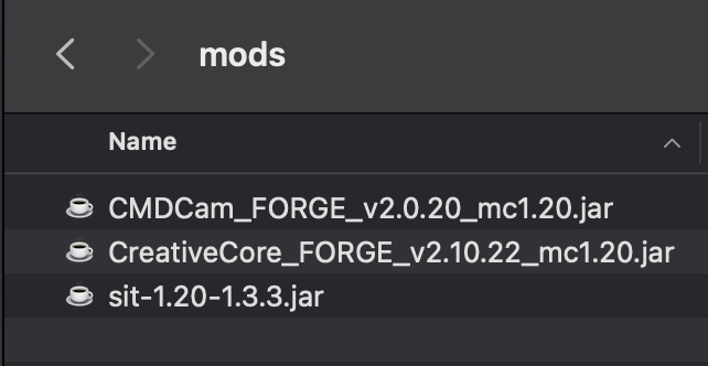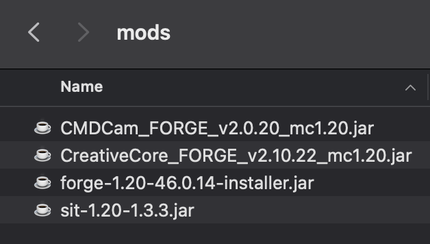 예시로, forge와 설치할 모드 3개 (CMDCam, CreativeCore, sit)를 준비했다.