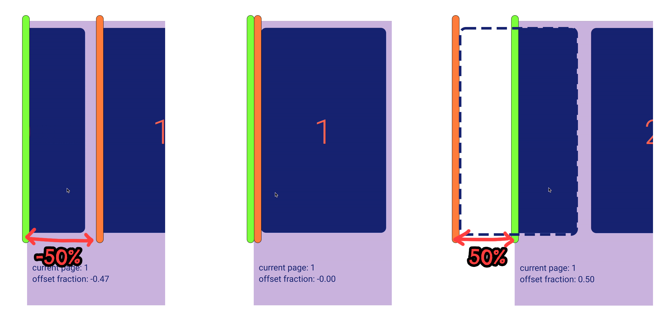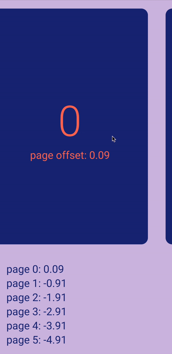 Pager State 에는 currentPageOffsetFraction이라는 멤버변수가 제공된다. 이름에서 알 수 있듯이, 현재 페이지에 대한 offset을 제공한다. offset은 -0.5 ~ 0.5 사이의 값으로 나타내어진다.