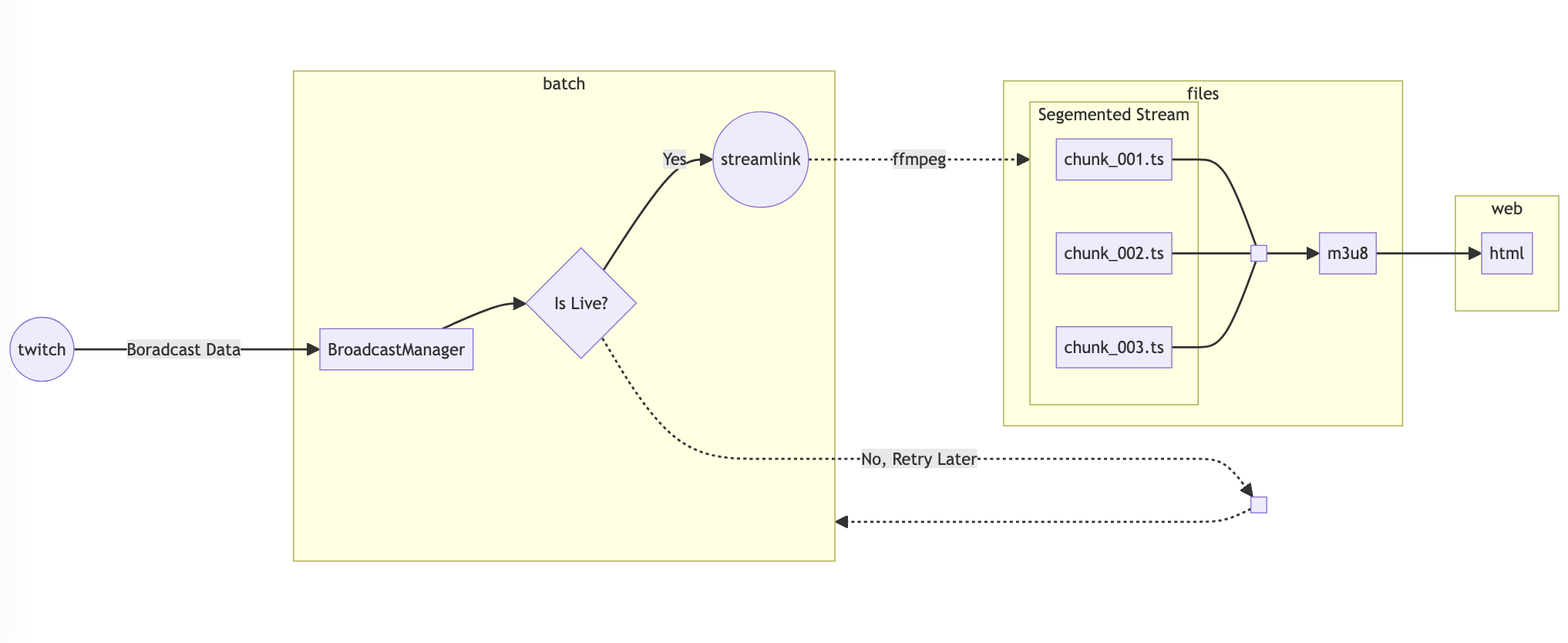 Twitch API를 통해 지금 Live중인지를 주기적으로 확인하고, 방송중일 경우 streamlink로 스트림을 받아와서 ffmpeg로 대략 10초마다 잘라서 ts파일로 저장해둔다. 한편 m3u8을 만드는 워커가 따로 존재하며, 이 워커는 현재 작업중인 방송에 대해서 여태까지 받아온 ts파일들을 기반으로 m3u8을 업데이트한다.