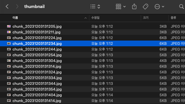 나는 ts파일이 이미 10초 단위로 쪼개져있었기 때문에 폴더안의 모든 파일을 돌면서 한 장씩 썸네일을 만들어주었다.