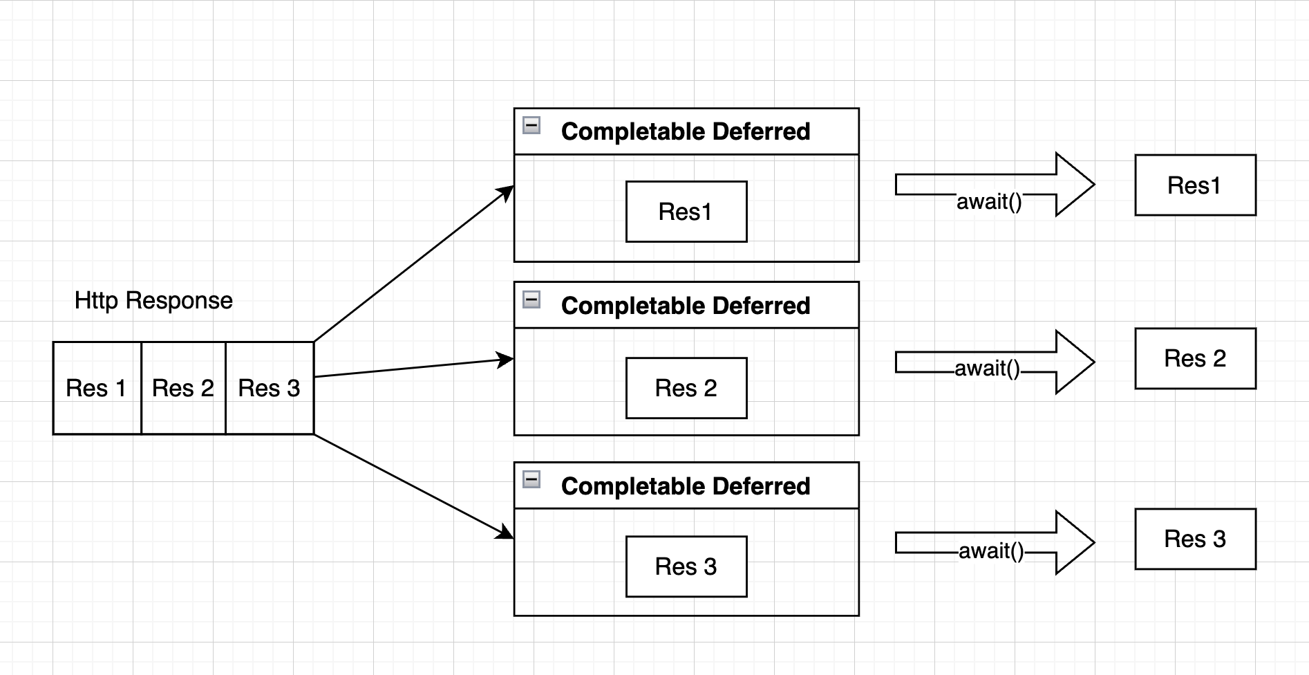 벌크처리된 응답으로부터 개별 요청에 대한 CompletableDeferred를 완료 시키고, 요청자는 await()로 모든 처리가 끝날때까지 기다리면된다.