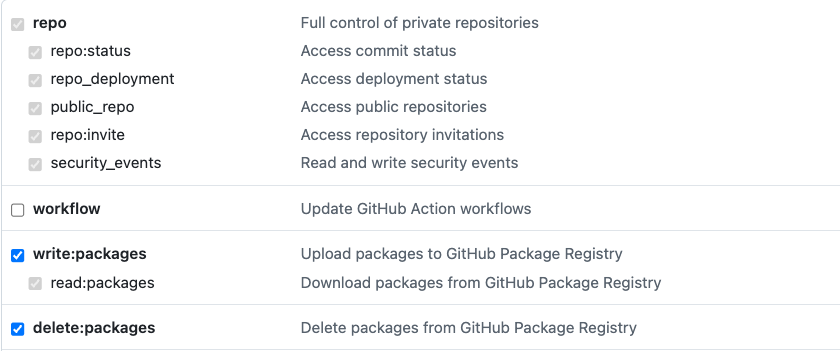 Tokens (Classic) 기준으로 아래 권한들을 부여한 Personal Access Token을 생성한다.