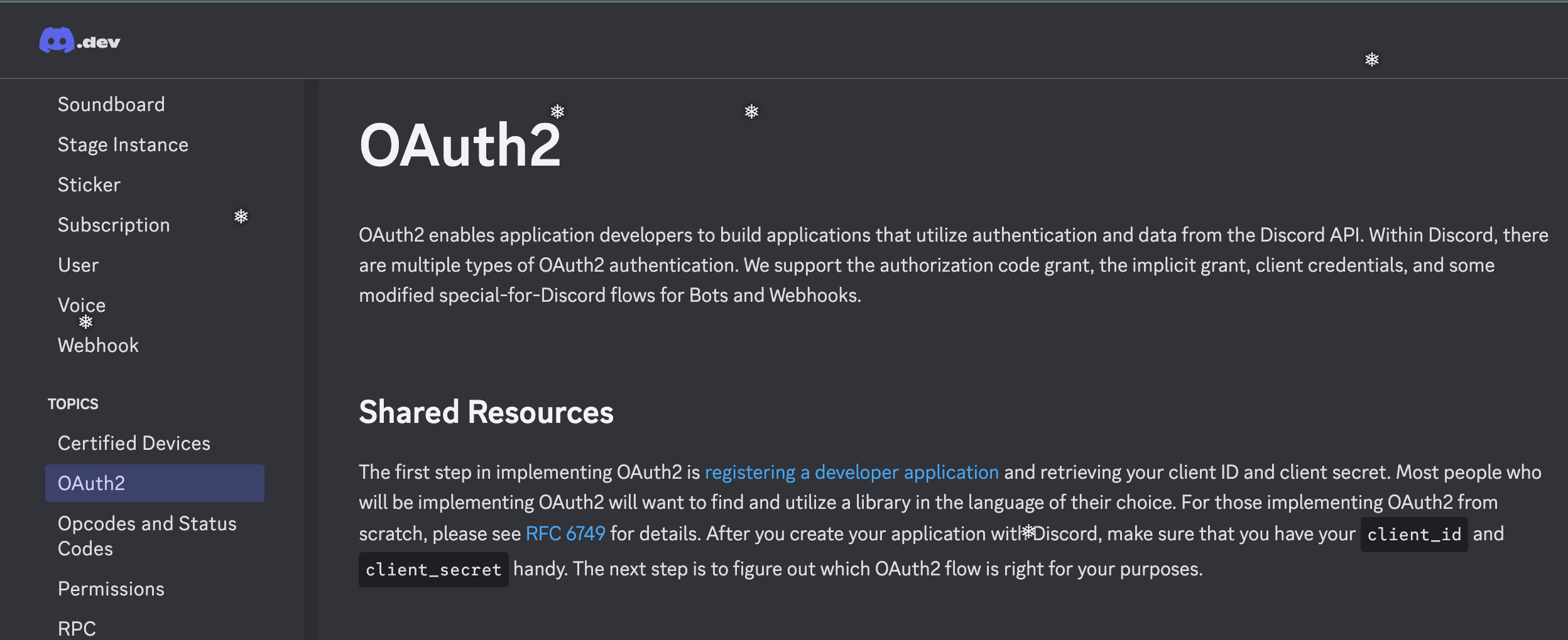 Discord OAuth2 연동 문서를 읽으며 느낀건데, Discord 문서는 정말 개발자 친화적이다. 읽으면서 정말 유용하고 이해하기 쉬워서 언젠가 API 문서를 작성하게 된다면 Discord 문서를 참고해야겠다는 생각이 들었다. iOS 개발자 문서 이후로 감명깊게 읽은(?) 개발자 문서.