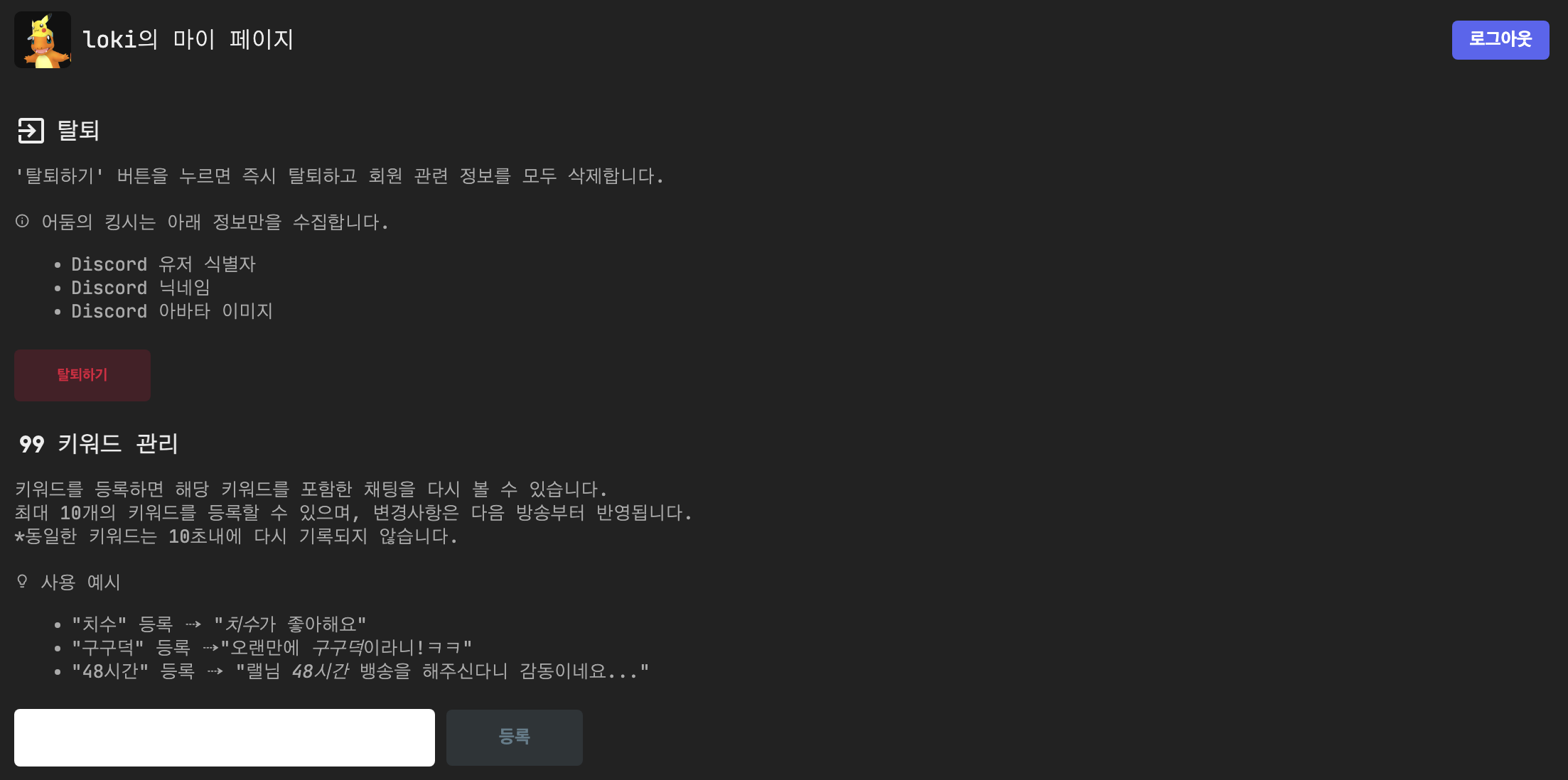 키워드를 관리하고, 회원 탈퇴 기능까지 필요하므로 마이페이지도 따로 만들어주었다.