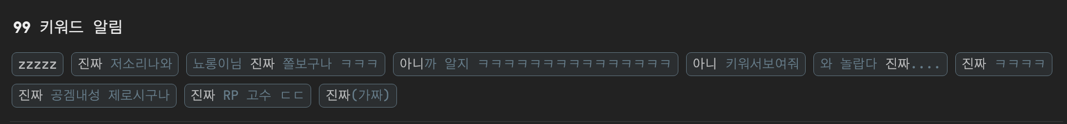얼마전 뜨거운 순간 기능을 업데이트하면서, DB도 추가하고 채팅 처리 파이프라인을 따로 빼면서 평소 해보고 싶었던 기능을 추가해보기로 했다. 그건 바로 키워드 알림! 예를 들어서 내가 스트리머가 "발헤임"이라는 게임을 정말 해주길 기다리고있는데, 채팅에서 "발헤임"이라는 키워드가 나왔을 경우 정말 그것과 관련한 이야기를 하고 있을 확률이 높다. 이렇게 내가 방송을 보지 못하는 순간에도 관련된 키워드가 언급되었는지 확인 하기위한 용도로 <키워드 알림>은 유용하게 쓰일 수 있다.