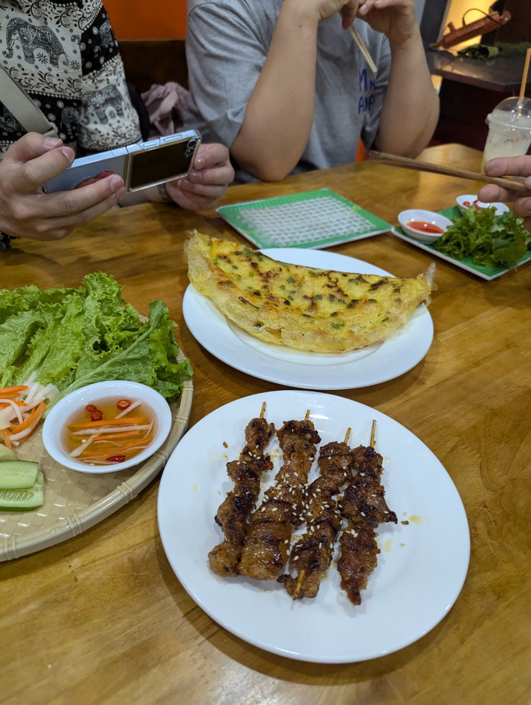 가격도 반쎄오 + 돼지고기 꼬치 + 돼지고기 짜조 + 오징어 쌀국수 + 공심채 볶음 5종합쳐