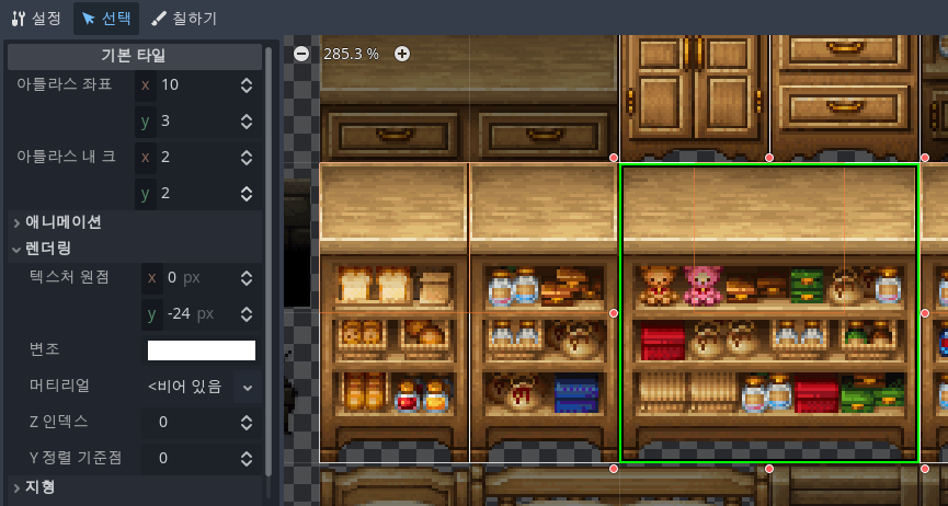 타일맵을 구성하는 중, 합쳐진 타일의 기준점이 중앙에가있어서 타일맵의 그리드에 딱딱 맞지 않게 그려지는 문제가 있었는데, 렌더링 > 텍스트 원점을 내가 그려지길 원하는 쪽으로 바꿔주었더니 잘된다.