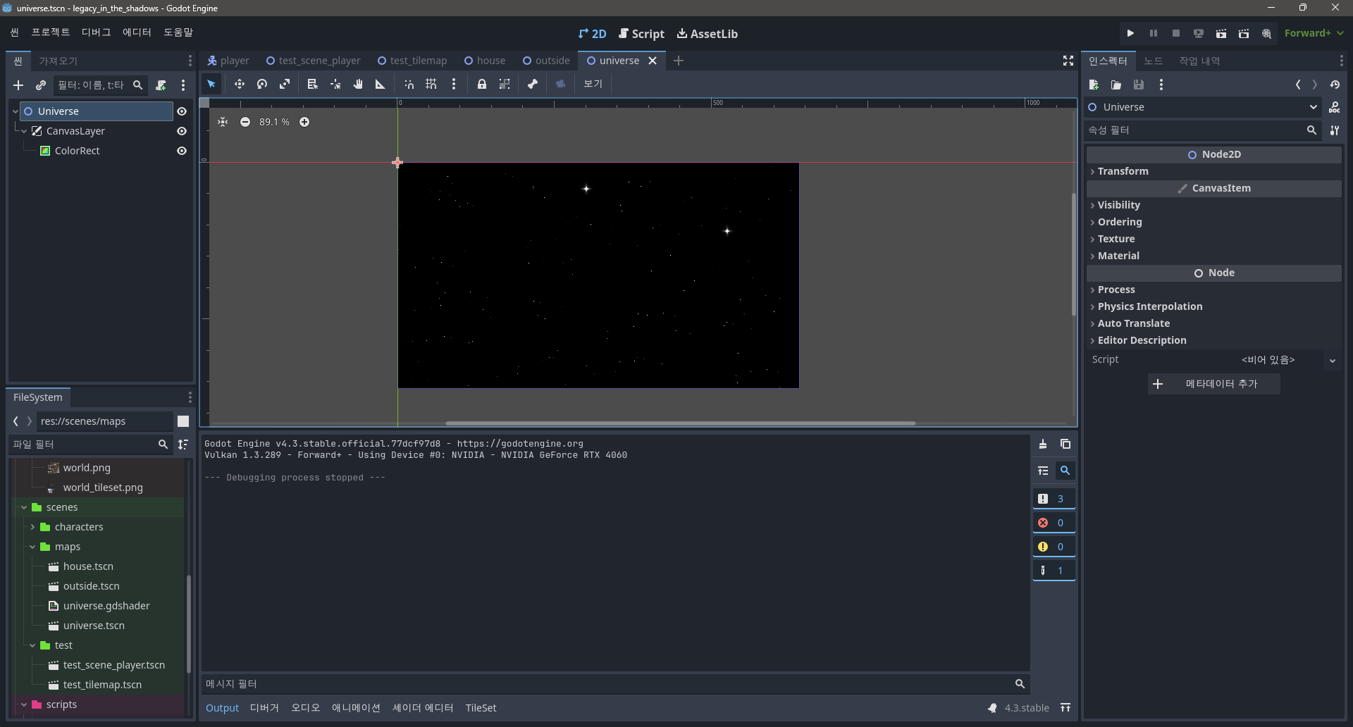 우주는 GodotShaders에서 우주 셰이더를 다운받아서 구현했다.