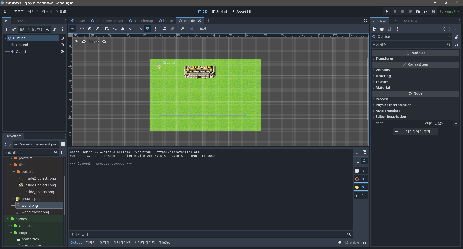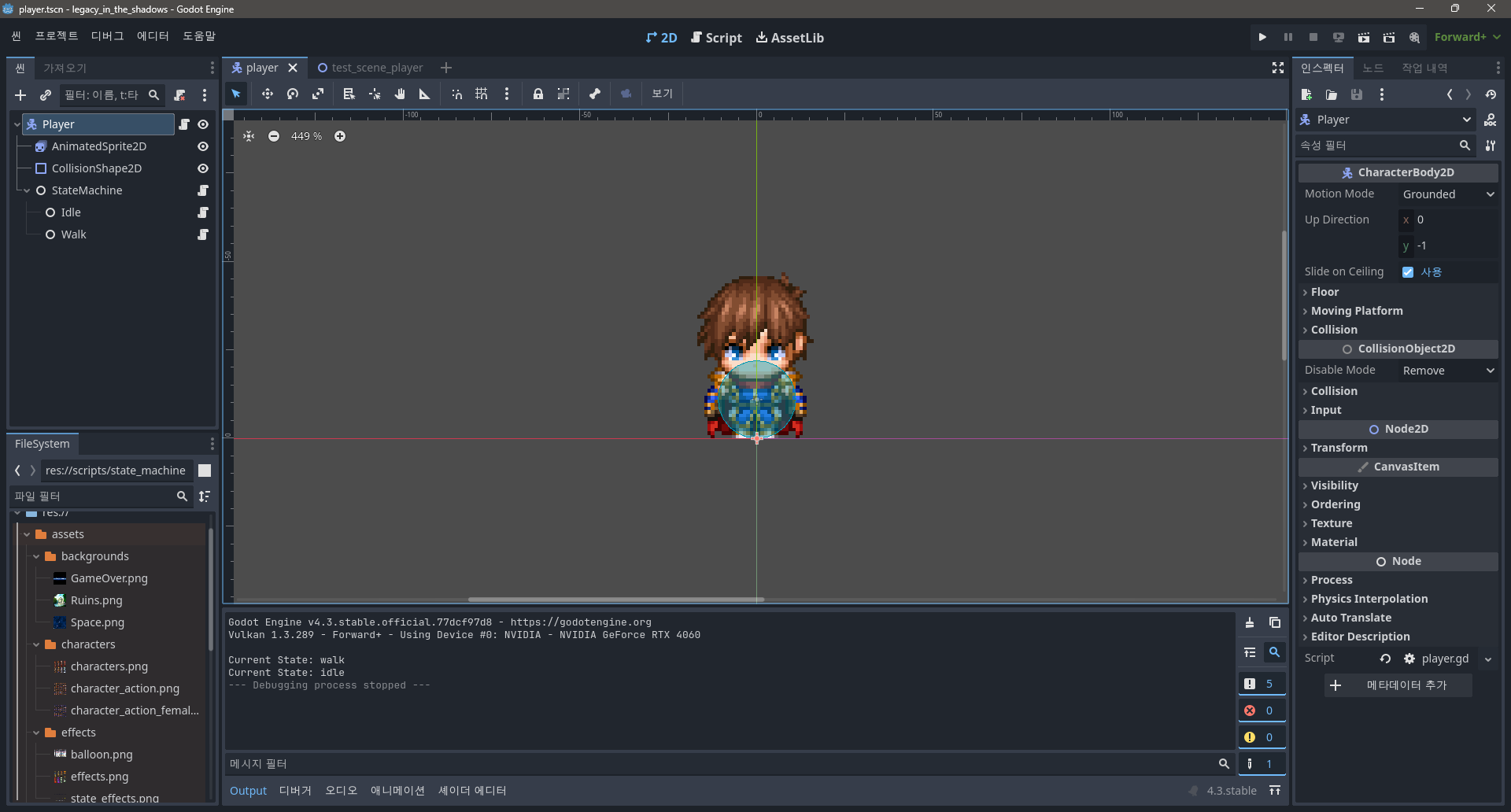 캐릭터가 다가가서 Interaction을 하는 시스템이 필요하기때문에, 튜토리얼을 참고해서 Actionable이라는 재활용가능한 Component를 만들었다. 캐릭터 방향을 바꾸면 direction_change signal을 만들고, Actionable을 Detect할 수 있는 Collider도 위치를 바꾸도록 했다. 사진에서 자주색 Collider가 그 부분.