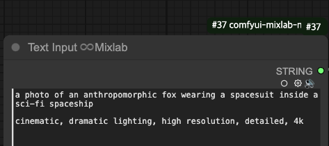 예시로, Text 프롬프트를 읽고 이미지를 출력하는 Workflow가 있다고하면 ComfyUI에서는 이런 TextInput Node를 준비하고, 이 노드의 출력을 CLIP Prompt 노드의 STRING 포트와 연결한다. 이 노드의 우측상단 귀퉁이에는 #37이라는 번호가있는데, 이것이 노드 ID다.
