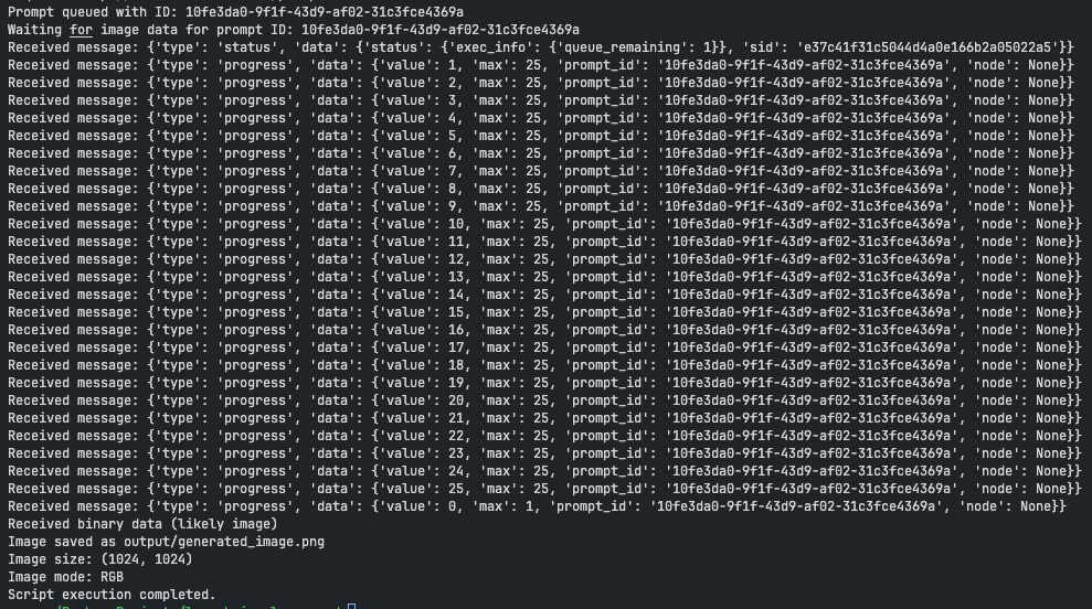 소스코드를 실행하면 다음과같이 진행상황이 쭉 찍히고, 이미지가 성공적으로 생성됨을 확인할 수 있다. ‘progress’ 단계에서 확인할 수 있듯이 value/max * 100은 이미지 처리의 진행률로 사용할 수 있는데, 실제 프로덕트 구현시에 사용하면된다.