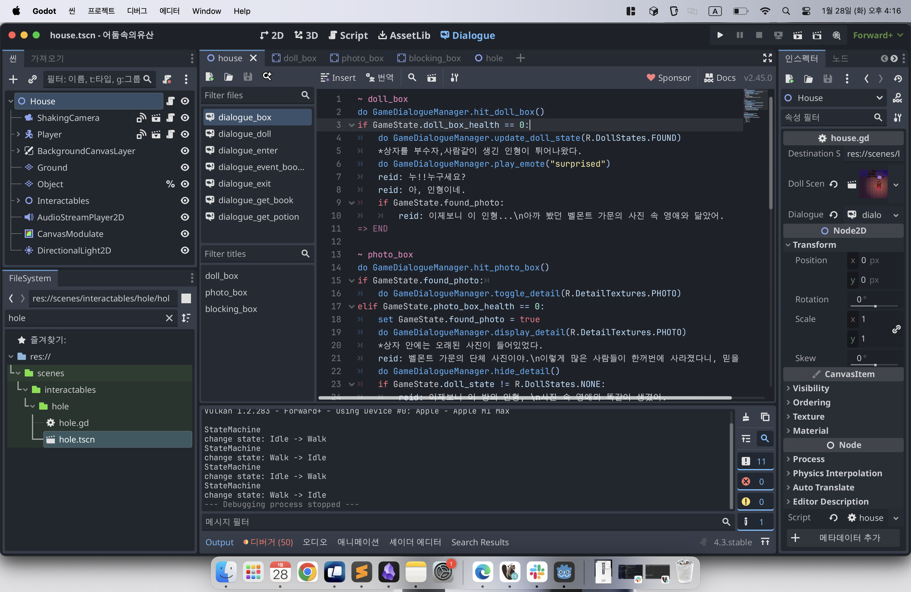 돌아와서, 어둠속의유산도 이벤트의 signal만 받게되면 TestScene에 해당 오브젝트가 있건말건 다이얼로그 진행을 할 수 있게되어서 조금더 부담없이 테스트 가능하게 되었다.