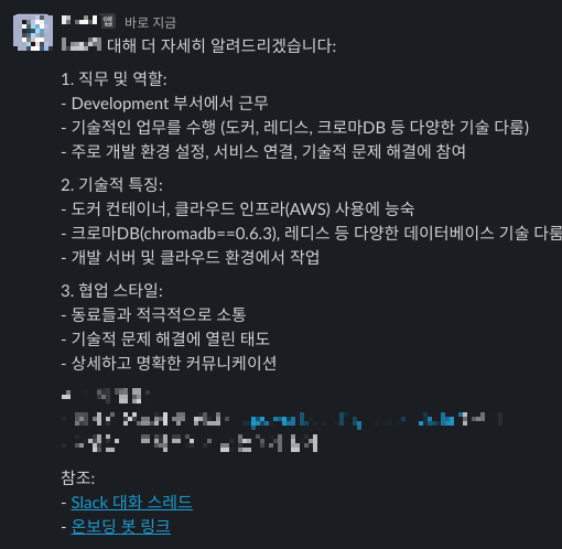 성공적으로 Agent를 구성하고 나에대해서 질문해봤다. 슬랙 프로필과 최근에 했던 말들에서 대충 어떤 사람인지 추측해서 결론을 낸 모습니다. 너무 단편적으로 본거같긴하지만...ㅋㅋㅋ