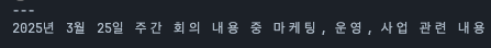 Google Gemini-2.0-Flash로 Contextual Embedding을 진행했다. 회의록은 노션 문서로 관리되고 있었는데, 문서 전체와 노션 페이지의 프로퍼티를 모두 넣어서 언제 회의인지 파악할 수 있도록 했다. 위 사진은 3월 25일자 진행된 회의록 청크에 붙은 Context 정보다.