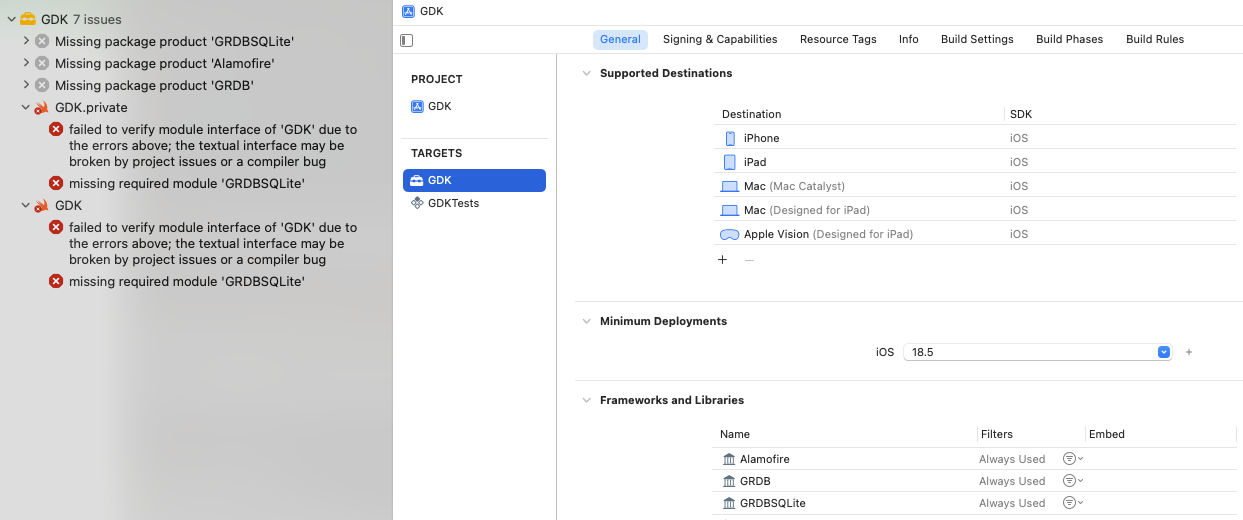Framework 내부에서만 GRDB를 사용한다면 import GRDB 대신에 internal import GRDB 로 GRDB를 사용한다면 Swift Interface에서 불필요한 GRDB 의존성이 노출되지않아 오류를 해결할 수 있다.