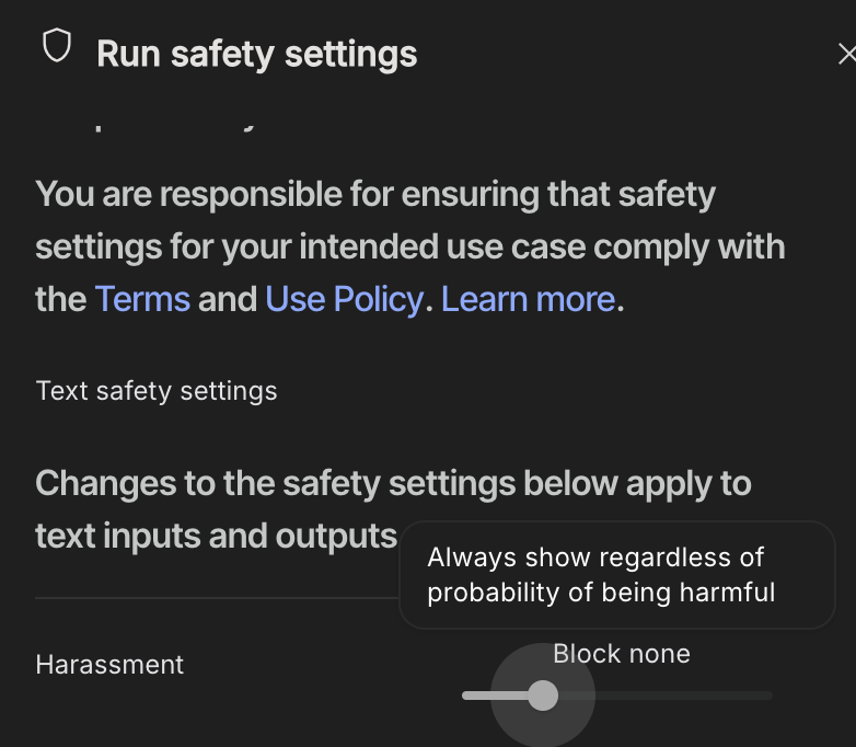 LMArena와는 다르게 모델의 파라미터를 조절할 수 있고, Safety Settings도 조절할 수 있다.