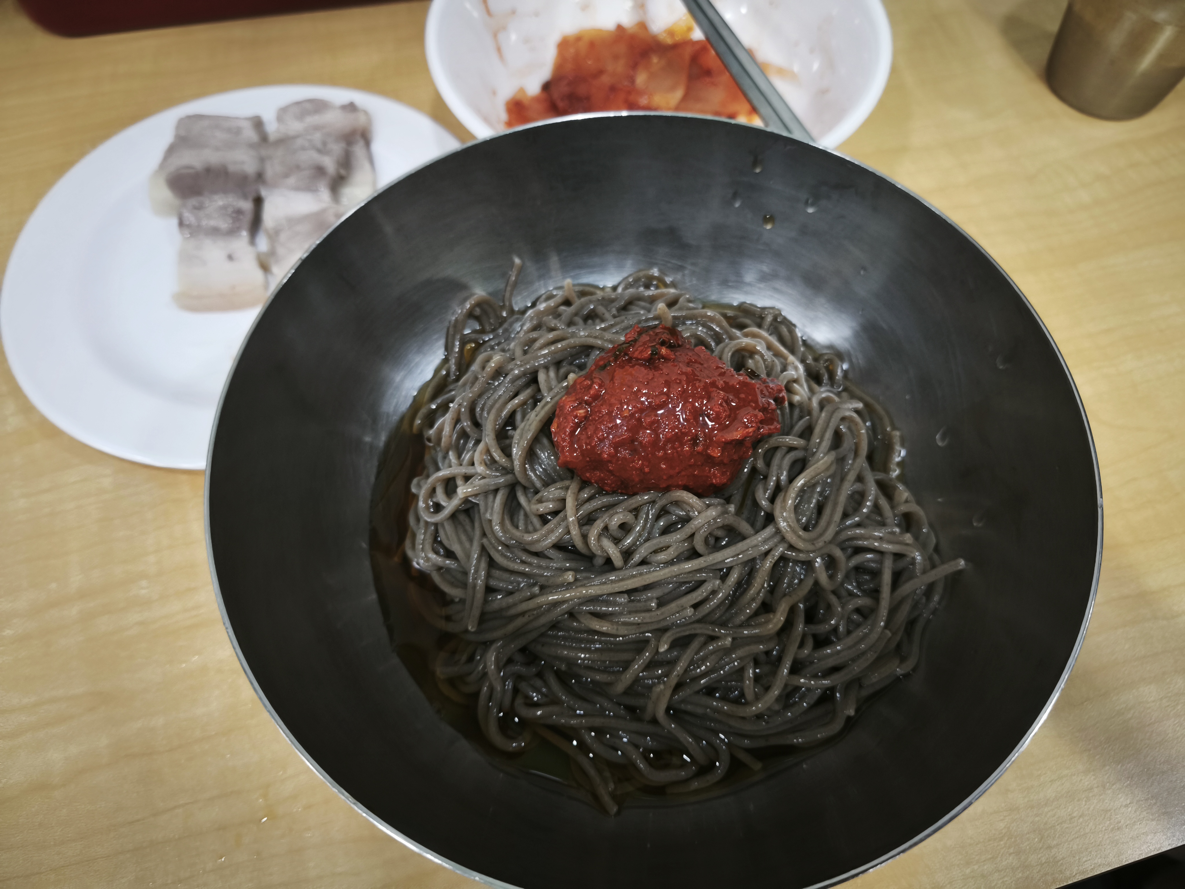 언제 한번 메밀이 100%로 들어간 미슐랭 막국수집에 방문한적이 있었는데, 메밀이 너무 많이들어가서 면이 푸석하고 뚝뚝 끊겼다. 건강에 좋을지 어떨진모르지만 맛으로 놓고보면 실망스러웠다. 성천 막국수는 면이 쫀득하고 탄탄한걸보면 메밀이 덜 들어간것같은데, 난 이쪽이 더 맛있었다.